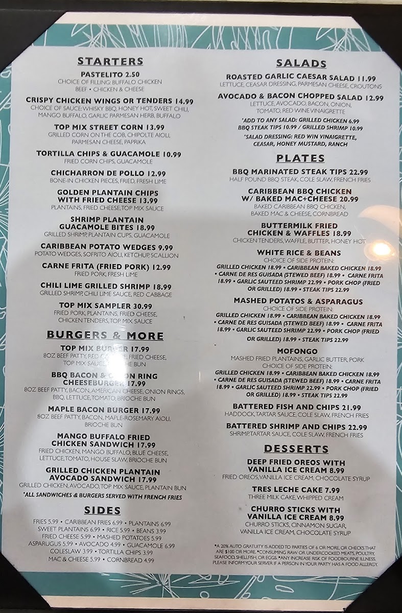 Welcome to Top Mix Bar & Kitchen, a culinary gem nestled in the heart of Roxbury, Boston. This vibrant eatery integrates a lively atmosphere with a tastefully crafted menu that celebrates delightful flavors. Start your experience with the Crispy Chicken Wings, perfectly seasoned and accompanied by an array of housemade sauces, or indulge in the Golden Plantain Chips paired with Dominican cheese for a unique twist. The salads, like the Roasted Garlic Caesar, invite customization with protein options for added heartiness.
